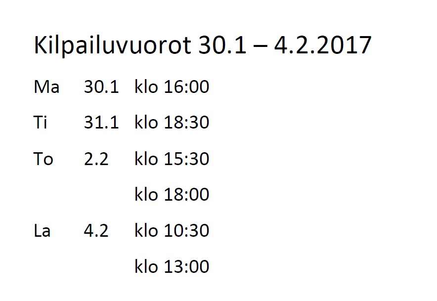 Yleinen Kilpailuvuorot 30.1 – 4.2.2017 24.1.2017 Marko Lahdentausta Jaa tämä: Jaa Facebookissa(Avautuu uudessa ikkunassa) Facebook Jaa WhatsApp palvelussa(Avautuu uudessa ikkunassa) WhatsApp Click to share on X(Avautuu uudessa ikkunassa) X Jaa Telegram palvelussa(Avautuu uudessa ikkunassa) Telegram Tulosta(Avautuu uudessa ikkunassa) Tulosta